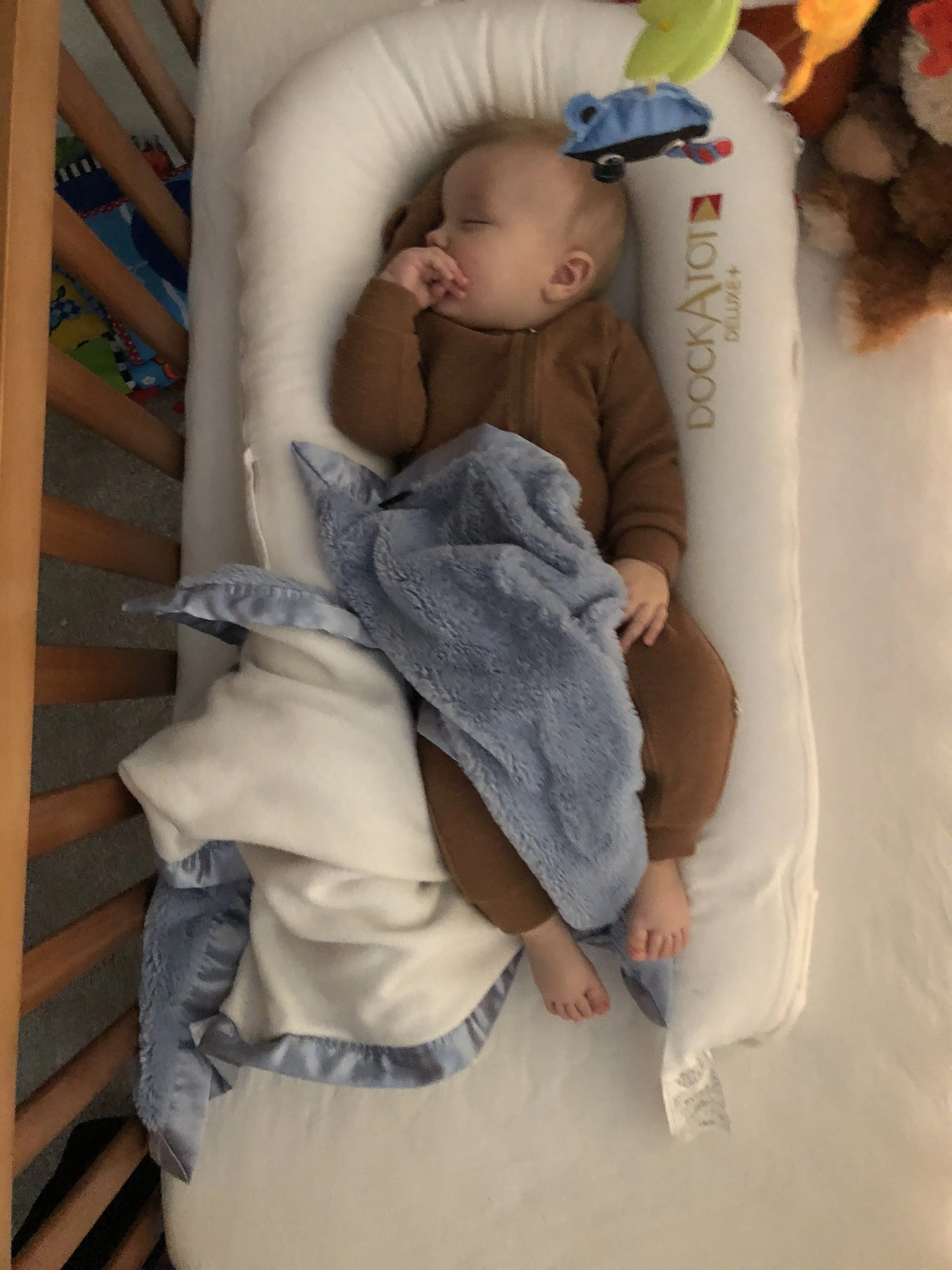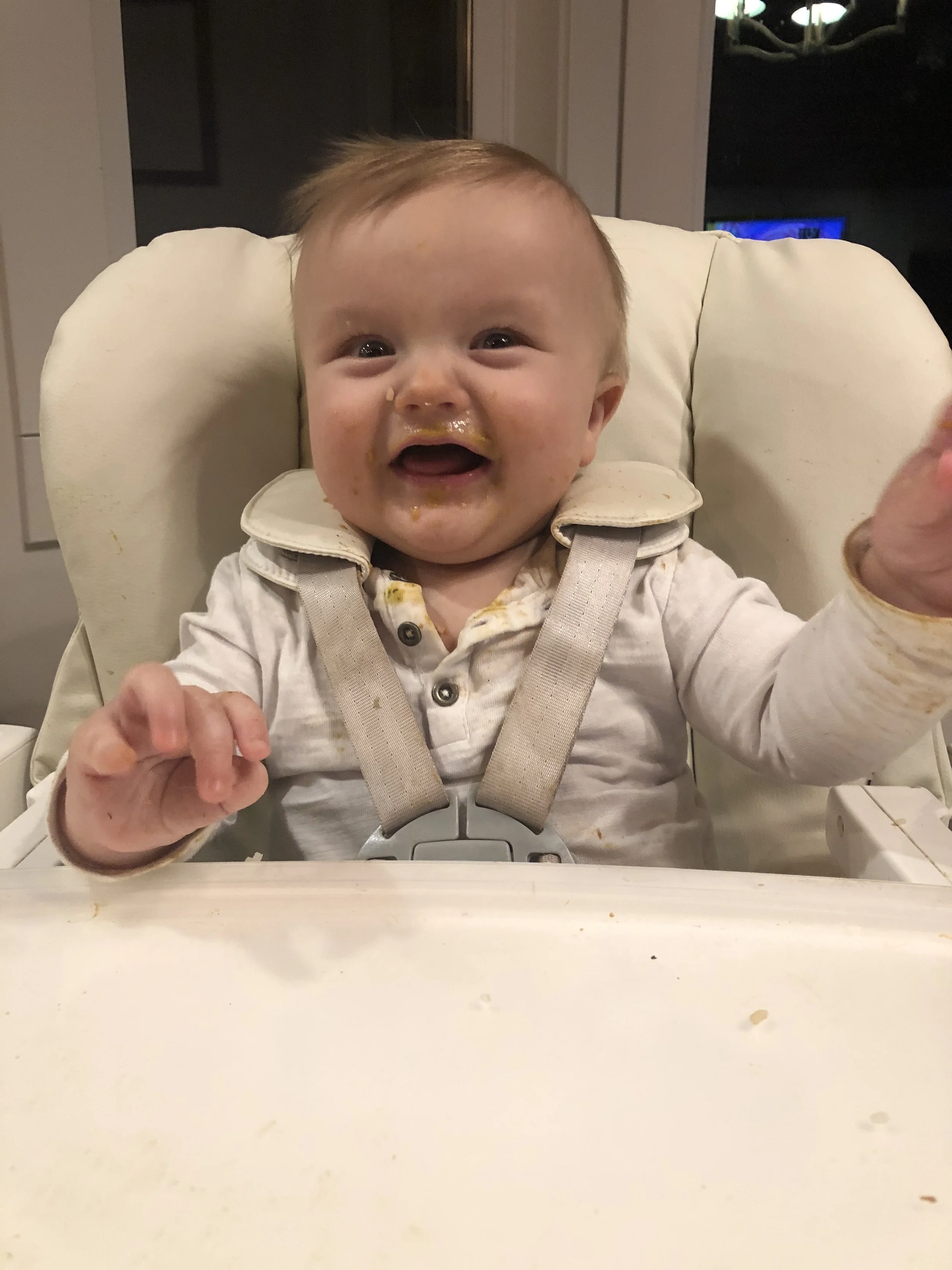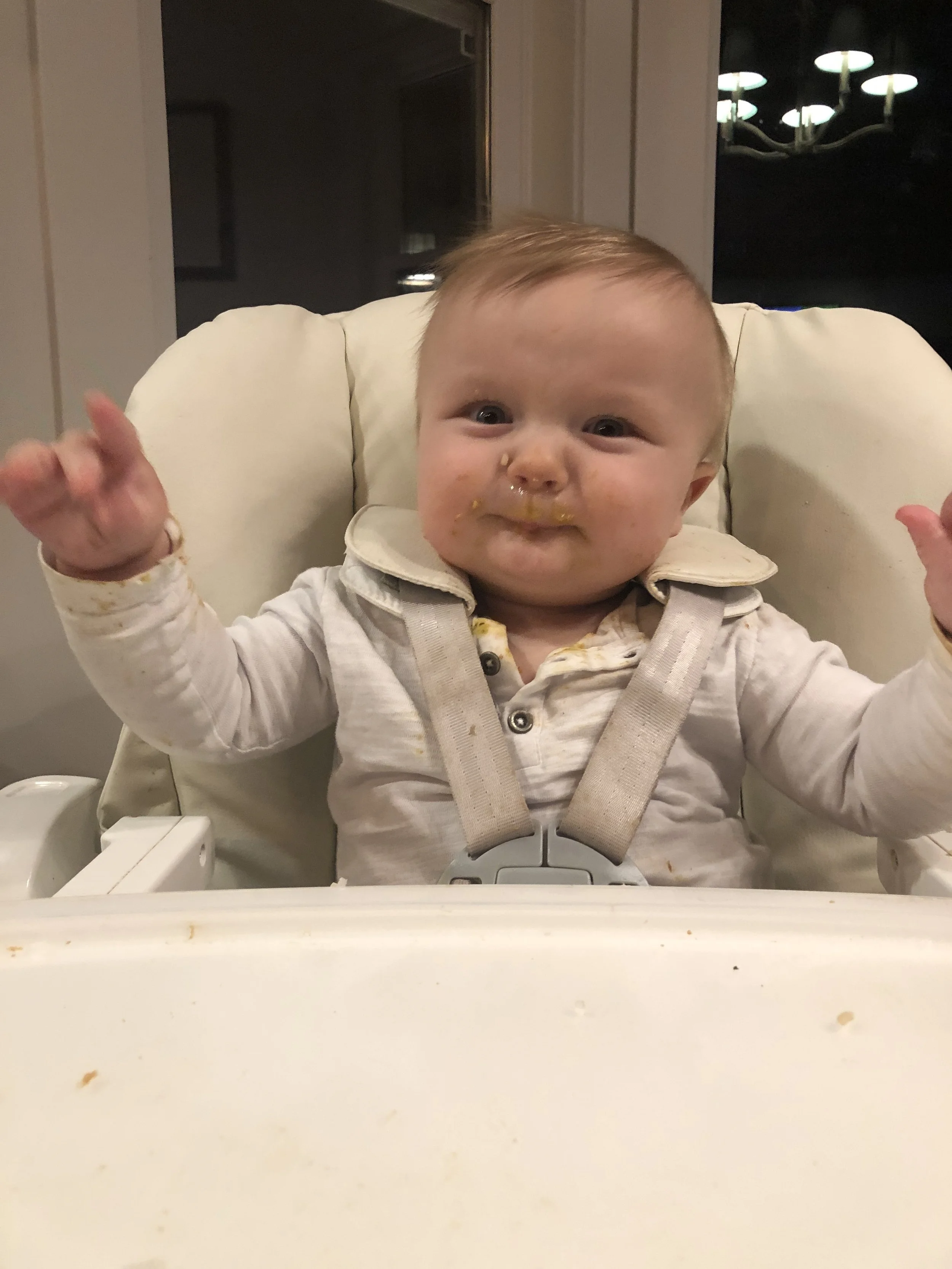 Sleep has kind of regressed since his 4 month post. He still sleeps in his dock-a-tot although I think I need to upgrade to the deluxe, unless I just take it away completely and put him in his crib. IDK what I want to do yet. He wakes up about 2-3 times now-a-days to nurse, but then goes right back to bed and sleeps til around 7-8am. He's still nursing about 4-5 times during the day, but is enjoying much more solids and food from moms plate. He loves those yogurt melts and puffs!