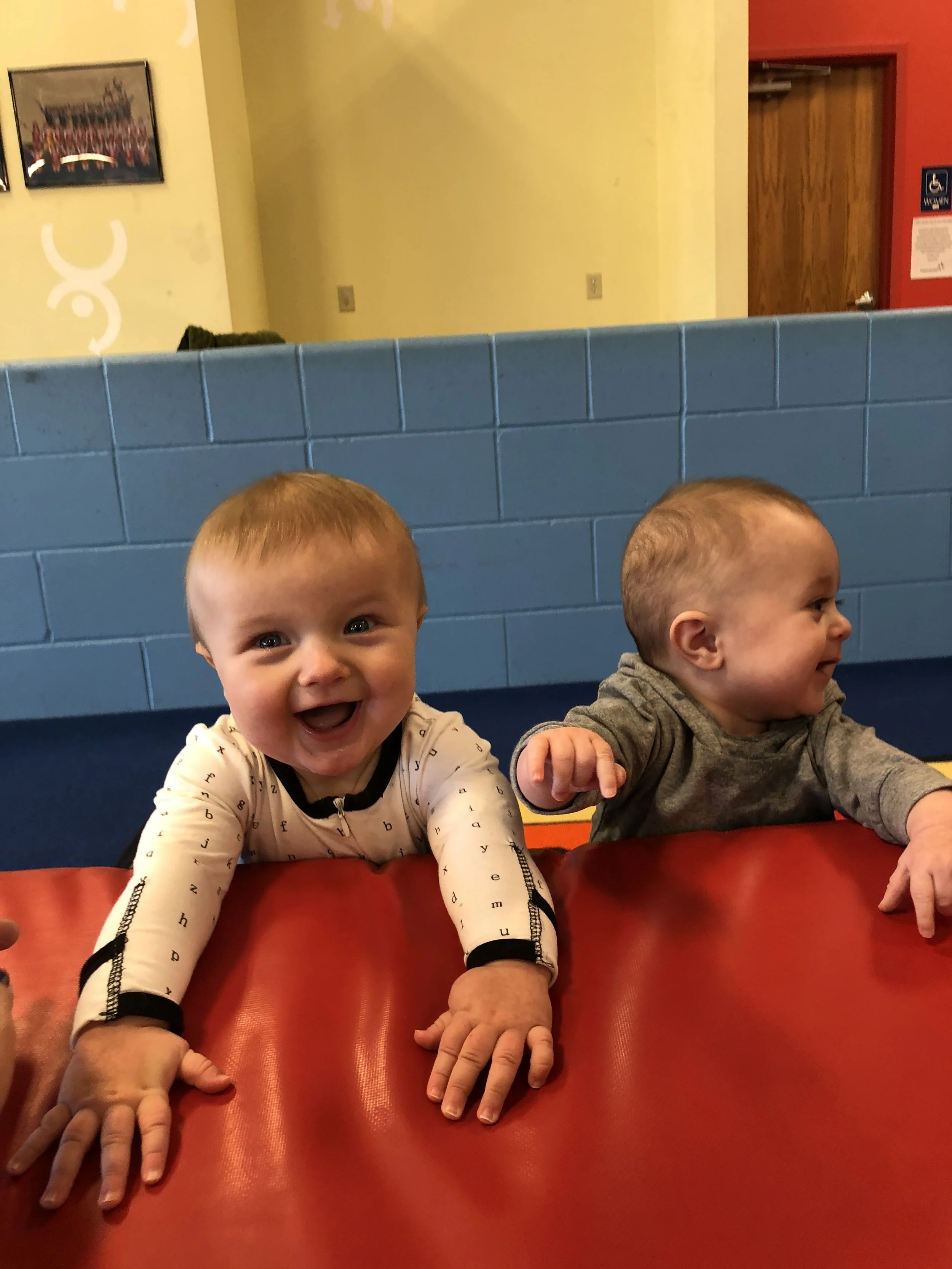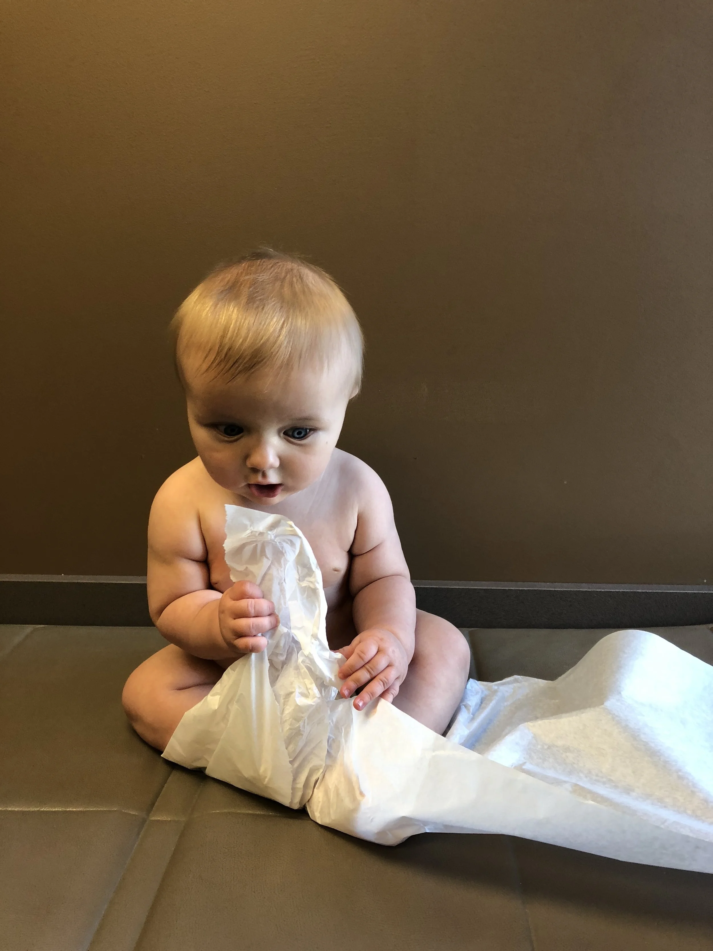 Attikus has enough hair to do a comb over, but its so dang thin. He got my hair., poor kid. Still no teeth, but they've been bothering him much more recently. His thighs are so chunky, like he doesn't even have rolls they're so big, if that even makes any sense! When his leg is straight, it has a huge fat roll above his knee.. and I just love it. His arms remind me of the michilan man or pillsbury dough boy. His eyes are still so expressive, and bright blue. He smiles non stop, however he does scowl at unfamiliar faces or people he doesn't see often. Stranger danger. He loves to pull hair and hit/rub you. I think he's just getting a sense of how his hands work. He can fully sit up by himself and roll over both ways. Loves to jump in his exersaucer, but when prompted to stand or try and walk, he's got no interest. He can reach for toys and pick them up, bring them to his mouth and switch toys from hand to hand. He still loves sucking on his pointer finger, and when he lays on his back he loves grabbing his feet and sometimes sucking on them!